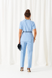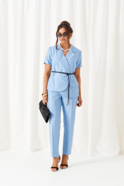 Женский льняной костюм с акцентными деталями и эффектные оттенки! Созданный отличительным кроем с подчеркнутыми деталями, костюм задаст уверенное настроение образу и подчеркнет индивидуальность при любом случае выхода. Выразительный костюм состоит из жакета и брюк, выполнен из мягкой смесовой ткани с натуральными волокнами льна и вискозы, практичен в носке. Жакет полуприлегающего силуэта, двубортный, асимметричный разноуровневый. На подкладке. Передняя часть из двух половинок, с вертикальными рельефами от плеча. На левой полочке расположен прорезной нижний карман с обтачкой и клапаном, вырез горловины оформлен пиджачным воротником с лацканом. Правая полочка укорочена и без дополнительных элементов. Спинка со средним швом и с вертикальными рельефами от плеча. Правый рельеф заканчивается функциональным разрезом-шлица. Рукав втачной, одношовный короткий. Застежка смещенная на потайные петли и пуговицы. Низ борта округлый. Дополнительным элементом служит декоративный пояс. Брюки длинной до щиколотки, слегка заужены к низу. Посадка классическая. Застежка центральная на молнию и на петлю с пуговицей на поясе. Спереди расположены боковые функциональные карманы. Пояс притачной, сзади на резинке, шириной 4см.