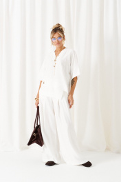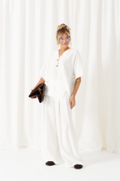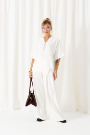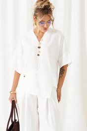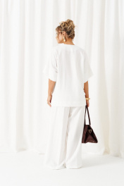 Женский льняной костюм из смесовой ткани с натуральным составом, с акцентными деталями и в безупречных любимых оттенках. Созданный в расслабленном крое с подчеркнутыми линиями, костюм позволит чувствовать себя комфортно и непринужденно. Стильный костюм состоит из блузона и брюк, выполнен из мягкой ткани с волокнами льна и вискозы, практичен в носке. Блузон свободного силуэта, цельнокроеного покроя с удлиненной линией плеча. Передняя часть цельная, с асимметричным подрезом, который оформлен разноуровневыми деталями-планками. Спинка цельная, чуть длиннее переда. Вырез горловины V-образный, обработан планками. Линия плеча удлиненная, спущенная, переходящая в цельнокроеный рукав, который заканчивается притачной манжеткой. Низ неровный, по боковым участкам выполнены разрезы. Брюки длинные, прямые свободные. Посадка стандартная, на поясе. Спереди выполнены карманы с обтачкой и заложены глубокие складки от пояса и от кармана. Сзади вытачки. Застежка центральная на молнию и на петлю с пуговицей на поясе. Пояс притачной, шириной 4см с эластичной тесьмой по заднему участку.