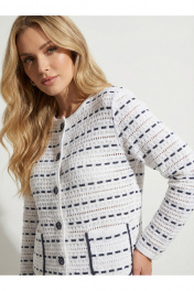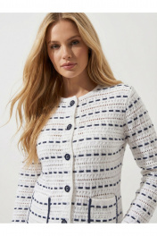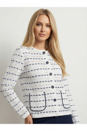 Жакет женский бело-синий вязаный на пуговицах Элегантный женский жакет — универсальная модель для создания стильных деловых и повседневных образов. Трикотажный жакет подчеркивает силуэт и обеспечивает комфорт в течение всего дня. Застежка на пуговицы актуальной в стиле classic и smart casual. Прямой крой, аккуратная посадка по фигуре делают жакет практичным и функциональным. Модель легко комбинируется с брюками, юбками, джинсами, топами и блузками. Подходит для офиса, работы, учебы, деловых встреч, мероприятий и повседневной носки. Идеальный вариант как офисный жакет, кардиган на пуговицах, легкий пиджак женский или базовый элемент капсульного гардероба.