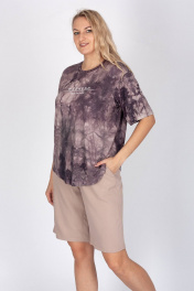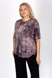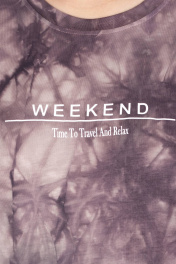 Фуфайка с втачным рукавом выполнена из трикотажного принтованного полотна в технике "батик", на груди объемная печать (перевод с анг. - "Выходной. Время путешествовать и отдыхать").