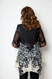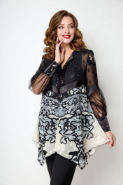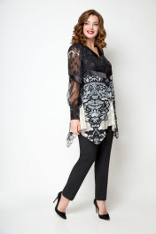 Комплект женский, состоит из туники и топа. Туника женская свободного силуэта, с круглым вырезом горловины, с вертикальной вставкой из отделочной тесьмы с пайетками, имитирующей центральную застёжку, с декоративной горизонтальной вставкой и с отрезной расклешённой нижней частью. Рукав втачной, с декоративной горизонтальной вставкой, с объёмной нижней частью и широкой притачной манжетой, которая застёгивается на петли и пуговицы. Блузка длиной ниже линии бёдер, с фигурным низом. Отделкой блузки служат декоративные пуговицы на планке переда. Топ полуприлегающего силуэта, с круглым вырезом горловины, с нагрудными вытачками, с открытой проймой, длиной до линии бедер.