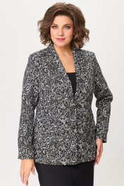Жакет удлиненный, из текстильной ткани, полуприлегающего силуэта с центральной бортовой застежкой на пуговицы до линии перегиба лацкана. Спереди рельефные швы от плечевого шва, отрезной бочок и карман с клапаном. Спинка с рельефами от плечевого шва. Рукав втачной, двухшовный, по низу рукава шлица на петли-пуговицы. Воротник пиджачного типа. Жакет на подкладке, длина по спинке 67 см, длина рукава 62 см.