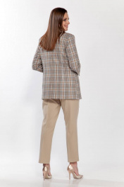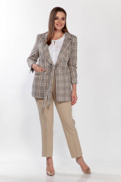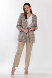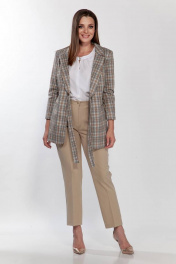 Комплект женский двухпредметный состоит из жакета и брюк. Жакет полуприлегающего силуэта выполнен из костюмной ткани в клетку с добавлением эластана на подкладке. Воротник сложного кроя с завязками и пуговицами, рукав двухшовный с разрезом, на полочке обработаны функциональные карманы с листочкой. Длина жакета 75 см, длина рукава 53 см. Брюки классические с высокой посадкой, полуприлегающего силуэта, выполнены из плотной костюмной ткани с добавлением эластана. Пояс без резинки, с застежкой молнией на пуговицу. В боковых швах карманы с листочкой. Длина брюк 103 см.
