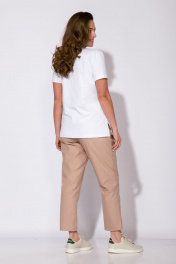 Комплект женский трехпредметный,состоит из ветровки,майки и брюк. Ветровка свободного силуэта,выполнена из хлопковой ткани без полкладки с накладными карманами на полочке и кулиской на талии.Рукав втачной с притачным манжетом на резинке по низу.Застежка молния.Длина куртки по спинке 80 см.Майка полуприлегающего силуэта,выполнена из вискозы.По центру притачная аппликация.В боковых швах разрезы.Брюки полуприлегающего силуэта с высокой посадкой,выполнены из хлопковой ткани,пояс на резинке.В боковых швах карманы с листочкой.Длина брюк 100 см.