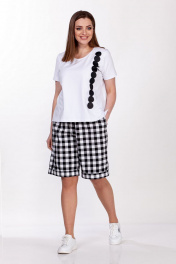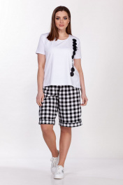 Шорты женские с высокой посадкой, выполнены из костюмной ткани в клетку с добавлением спандекса. Пояс без резинки, с застежкой молнией на пуговицу. В боковых швах карманы с листочкой, по низу манжет с отворотом, длина- 56 см.