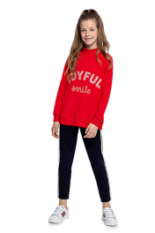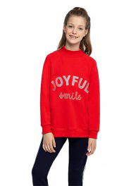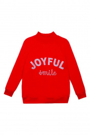 Красный джемпер для девочки свободного силуэта дополнен высоким воротником, манжетами на рукавах и стильным принтом с надписью с блестками. Трикотажная ткань футер гарантирует износостойкость и приятные тактильные ощущения.