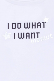 Белая футболка для девочки с круглым вырезом горловины. Принт в стилистике капсулы "Кот-Арт". Декоративные элементы на рукавах.