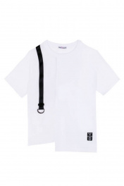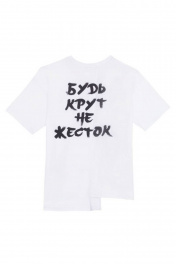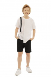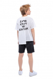 Повседневная футболка для мальчика прямого фасона из ткани кулирная гладь. Короткие рукава и круглый вырез горловины. Принт-надпись на спинке и декоративная вставка из сорочечной ткани. Изделие дополнено контрастным кантом с фурнитурой и нашивкой.