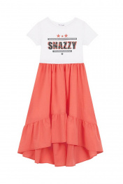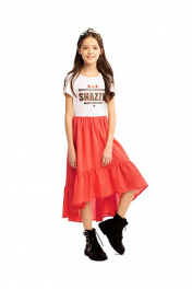 Коралловое платье для девочки с коротким рукавом и круглым вырезом горловины. Принт и стразы в стилистике капсулы "Армия стиля". Юбка с оборками.