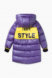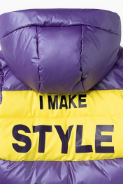 Ультрамодная, комфортная куртка для девочки. Куртка выполнена из плащевой ткани с блеском. Утеплитель-синтепух, ткань подкладочная-флис, нейлон. Модель прямого силуэта, немного расширена книзу, с горизонтальной стёжкой. Воротник и манжеты рукавов из трикотажного полотна с дизайном шрифтовой тематики 2 цветов. Куртка с притачным комфортным капюшоном с регулировкой на эластичный шнур контрастного цвета и фиксаторы. Центральная застежка на молнию "трактор" с втачной ветрозащитной планкой, контрастного цвета. По талии куртка с регулировкой на эластичный шнур контрастного цвета и фиксаторы. В нижней части переда – удобные под наклоном прорезные карманы-листочки, с фигурными отделочными строчками имитирующими накладные карманы. В верхней части спинки вставка контрастного цвета, декорированная трансфертной плёнкой шрифтовой тематики. Ультрамодная, стильная, тёплая куртка на холодную зиму.