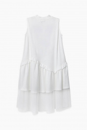 Платье-трапеция без рукавов, с воротником-стойкой, выполнено из молочно-белой кулирной глади с дополнительным слоем из сетки в тон. По низу - широкий асимметричный волан с рюшей. Декорировано текстово-графическим принтом