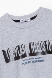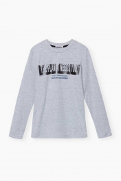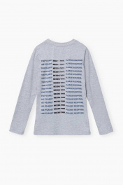 Серый джемпер прямого кроя из меланжевой кулирной глади серого цвета. Круглая горловина, длинные рукава. Декорирован контрастной шрифтовой композицией спереди и сзади.