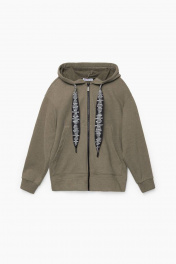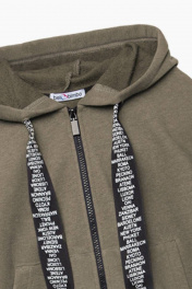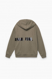 Свободная толстовка с удобным капюшоном с декоративной регулирующей тесьмой. Выполнен из меланжевого футера цвета хаки с отделкой из рибаны. Декорирован контрастным слоганом на спинке, выполненным в технике термотрансфера