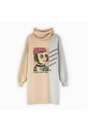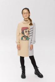 Платье в стиле колор-блок. Комфортная модель прямого силуэта с воротником-трубой. Модель декорирована тематическим принтом.
