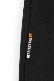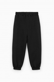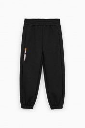 Базовые чёрные брюки-джоггеры для мальчика. Прямая модель со средней посадкой. Изделие без застёжки, на мягком поясе. Карманы в шве. Брюки декорированы авторской надписью.