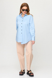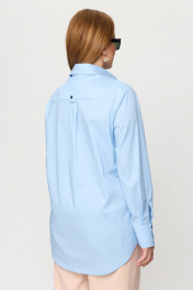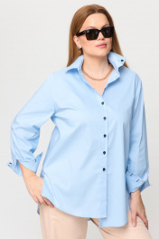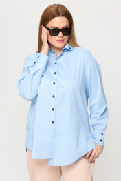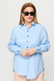 Рубашка прямого силуэта подходит под любые формы и типы фигуры. По спинке имеется кокетка с пришивной петелькой и пуговицей чёрного цвета. Эффектный образ создается за счет необычных деталей и элементов. Петли выметаны в цвет пуговиц. Ассиметричные манжеты и чёрные пуговицы фишка этой рубашки. Голубая рубашка– это не только стильно, но и эффектно, а ещё и удобно. Прямой силуэт, который стройнит и голубой цвет сочетается со всей палитрой одинаково классно. Добавляем эту рубашку к любому “низу” образ готов. Модель OverSize.