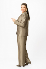 Стильный женский костюм, выполнен в классическом стиле из ткани с небольшим блеском. Костюм состоит из жакета и брюк. Жакет полуприлегающего силуэта, по переду прорезные карманы с клапаном. Горловина «V» образная, застежка центральная на петли-пуговицы. По спинке в центральном шве отлетная шлица по низу. Рукава втачные, по низу отлетная шлица с декором из пуговиц. Жакет на подкладке. Брюки прямые от бедра, с застроченными стрелками по переду и спинке. Застежка по линии банта на молнию и крючок. Верх брюк на обтачке. Длина жакета – 69 см Длина рукава – 63 см Длина брюк по боковому срезу – 109 см Длина брюк по шаговому шву – 82 см
