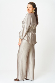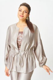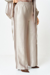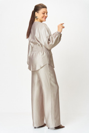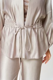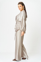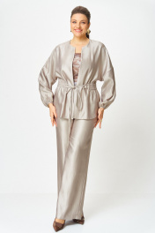 Стильный женский костюм выполнен из ткани с небольшим блеском. Костюм состоит из жакета и брюк. Жакет свободного силуэта со спущенной линией плеча, горловина круглая. Жакет без застежки, фиксируется на уровне талии завязками. Рукава 3/4, со сборкой по низу. Жакет без подкладки. Брюки свободного силуэта, верх брюк на поясе с резинкой. Длина жакета – 74 см Длина рукава – 38,5 см Длина брюк по боковому срезу – 112 см