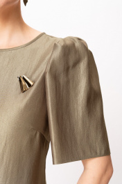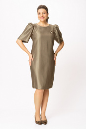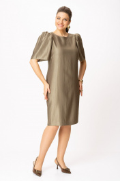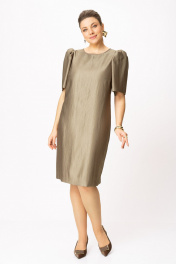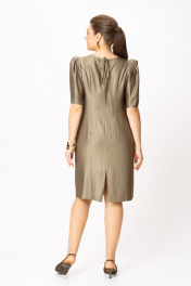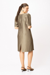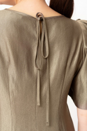 Элегантное женское платье, выполнено из плательной ткани с небольшим блеском. Платье полуприлегающего силуэта, горловина круглая. По спинке в центральном шве разрез возле горловины с завязкой и разрез по низу. Платье без подкладки. Длина платья – 97 см Длина рукава – 36 см