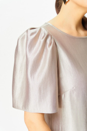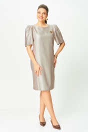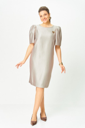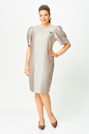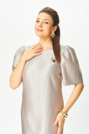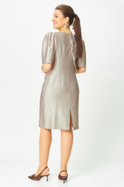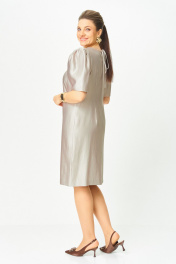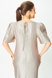 Элегантное женское платье, выполнено из плательной ткани с небольшим блеском. Платье полуприлегающего силуэта, горловина круглая. По спинке в центральном шве разрез возле горловины с завязкой и разрез по низу. Платье без подкладки. Длина платья – 97 см Длина рукава – 36 см