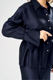 Элегантный женский костюм из ткани с небольшим блеском. Костюм состоит из блузы-рубашки и юбки. Рубашка свободного силуэта с центральной застежкой на петли пуговицы, горловина с рубашечным воротником. Рукава со спущенной проймой, по низу притачной волан с резинкой. Юбка расширенная к низу, по переду фигурный рельеф с разрезом по низу, застежка в среднем шве спинки на тесьму молния. Юбка на подкладке. В комплект входит тонкий пояс- шнурок.