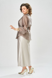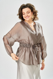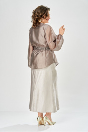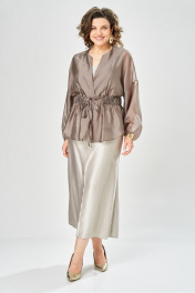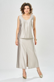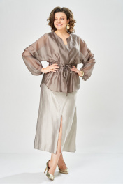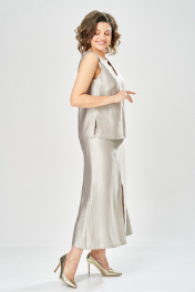 Элегантный женский комплект состоит из трёх предметов, топа, блузы и юбки. Выполнен из двух видов ткани. Топ прилегающего силуэта из плательной ткани с небольшим блеском. Топ на широких бретелях. Горловина и пройма обработаны обтачкой. Юбка расширенная к низу, по переду фигурный рельеф с разрезом по низу, застежка в среднем шве спинки на тесьму молния. Юбка на подкладке. Блузон выполнен из полупрозрачной легкой ткани, свободного силуэта, без застежки, горловина круглая, линия плеча спущенная, рукава широкие со сборкой по низу. Блуза по линии талии собрана на резинку по центру переда фиксируется на завязки Длина блузы – 74 см Длина рукава блузы – 38,5 см Ширина плеча блузы – 33,5 см Длина юбки – 93 см Длина топа по среднему шву – 57 см Ширина бретели – 7 см.