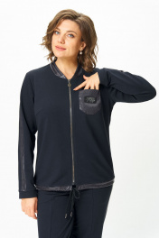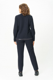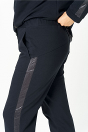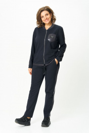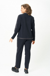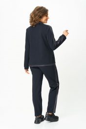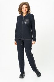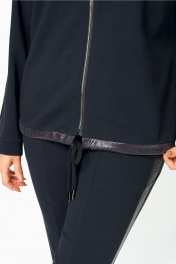 Стильный женский костюм, состоит из блузона и брюк. Костюм выполнен в спортивном стиле. Блузон полуприлегающего силуэта с центральной застежкой на тесьму молнию, с левой стороны на уровне груди фигурный накладной карман с пришивной нашивкой. Горловина оформлена планкой из отделочной ткани. Рукава втачные с отделочным лампасом по центру, низ рукава на манжете из основной ткани. По низу блузона притачная планка с декоративным шнуром. Брюки, зауженные к низу, по верху на задних половинках отрезные кокетки, по боковым швам от кокетки до низа отделочные лампасы, на уровне бедер в швах функциональные карманы. Верх брюк оформлен отрезным поясом с резинкой. Длина блузона по спинке (54-58) – 68.5 см Длина блузона по спинке (60-64) – 70 см Длина рукава блузона - 61,5 см Длина брюк (54-58) -103 см Длина брюк (60-64)-105 см