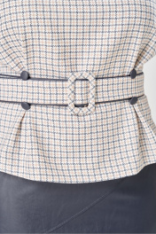 Стильный женский костюм состоит из блузы из плательной ткани и юбки из кожи. Блуза с цельнокроеные рукавом и круглой формой горловины. По переду на уровне талии обработаны складки-защипы. Спинка со средним швом с разрезом у горловины. По низу рукава расположены по две отделочные пуговицы из кожи. К блузе прилагается ремень, выполненный из сочетания кожи и плательной ткани. Юбка зауженная к низу на подкладке. Перед юбки с фигурными подрезами и отделочными строчками по ним. По спинке средний шов с застёжкой на тесьму-молния и разрезом по низу. Верх юбки оформлен отрезным поясом с резинкой. Длина блузы - 60 см Длина рукава – 53 см Длина юбки – 62 см