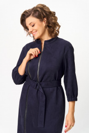 Элегантное женское платье из ткани искусственная замша. Платье полуприлегающего силуэта. По переду платье декорировано двумя рядами молнии. Горловина оформлена воротником стойка, в боковых швах на уровне бедер карманы. Спинка с центральным швом. Линия плеча спущена. Рукава втачные, длина ¾, низ на резинке. Длина платья по спинке – 108 см Длина рукава – 44 см