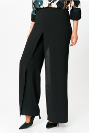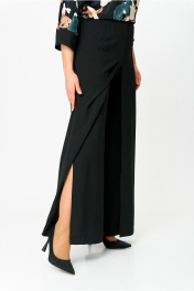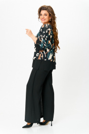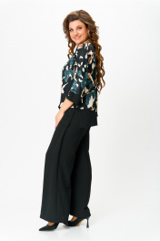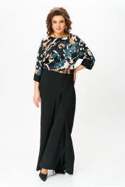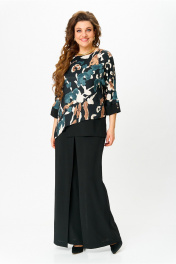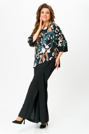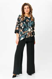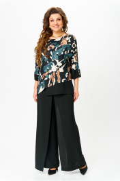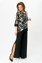 Элегантный женский комплект, выполнен из двух видов ткани, атласа с принтом и “жатки”. Блузон свободного силуэта с цельновыкроенными рукавами, по низу рукавов притачные манжеты с декоративными пуговицами. Горловина кругла, по низу блузона притачные детали имитирующие двухслойность. Блузон украшен пришивной брошью. Брюки свободного силуэта, по переду двухслойные, верхняя деталь отлетная, в боковых швах от уровня колена, разрезы. Верх брюк обработан поясом на резинке. Длина блузона– 69 см Длина рукава от горловины – 55 см Длина брюк – 111 см