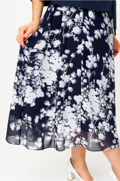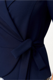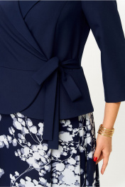Элегантное женское платье, выполнено в виде имитации костюма из двух видов ткани. Лиф из плательной ткани, юбка из шифона. Платье с запахом, горловина с воротником пиджачного типа с отложными лацканами. Рукава втачные, длина 3/4. Юбка со складками по линии талии, расширенная к низу, на подкладке. По линии талии вставлен завязывающийся пояс. Длина платья – 124 см Длина рукава от горловины – 47.5 см