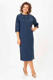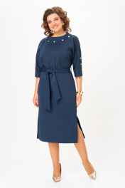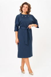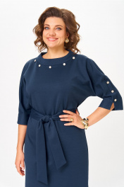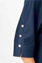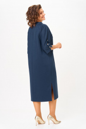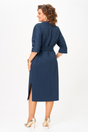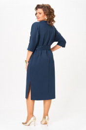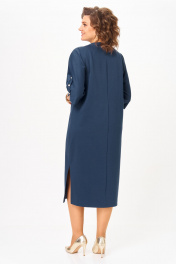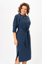 Платье полуприлегающего силуэта из трикотажного полотна с цельнокроеным рукавом длиной три четверти. В верхнем шве рукава обработана декоративная планка с пуговицами и разрез по низу. Горловина широкая с воротником-стойка. Со стороны спинки в воротнике обработана застежка с навесными петлями и пуговцами. Вдоль шва горловины расположены декоративные пуговицы. В боковых швах обработаны разрезы. Платье с декоративным поясом из основной ткани и шлевками в боковых швах. Платье без подкладки. 48 50 52 Длина спинки 111 111 111 Ширина изделия на уровне 54 56 58 глубины проймы 1/2 Ширина по линии талии 50 52 54 Ширина по линии бедер (низа) 1/2 53 55 57 Длина рукава от горловны 46 46 46 Ширина рукава вверху 1/2 25 25 25