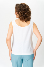 Стильный женский комплект, выполнен в классическом стиле. Жакет полуприлегающего силуэта, с центральной застежкой на одну пуговицу, борт с отворотом лацкана и воротником пиджачного типа. По переду накладные карманы с клапаном, рукава втачные с подрезом по линии локтя и патой для подхвата рукава на пуговицы. Жакет без подкладки. Все отделочные строчки на костюме выполнены контрастными нитками. Брюки заужены к низу, по боковым швам на уровне бедер наклонные карманы с подрезным бочком, пояс на резинке. По низу брюк отложной манжет. Топ полуприлегающего силуэта, на широких бретелях. Длина жакета по спинке – 72 см Длина рукава жакета – 63 см Длина брюк по боковому срезу – 101,5 см Длина топа – 46 см