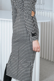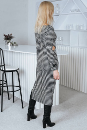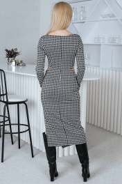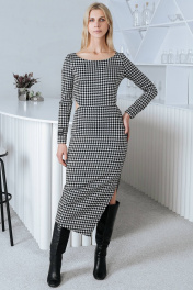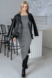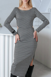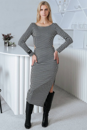 Женское платье прилегающего силуэта, идет в размер. Изготовлено из плотной эластичной ткани. Горловина округлой формы. Рукава длинные втачные, в нижней части одного рукава расположена стильная нашивка. Платье отрезное по линии талии, по боковым швам в области талии выполнены фигурные разрезы. По левому боковому шву выполнен асимметричный разрез. Платье представлено на девушке 44 размера, рост 173 см.