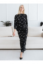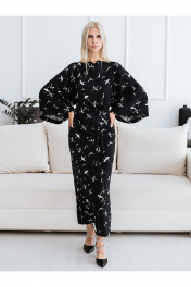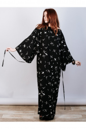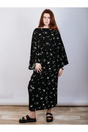 Женское летнее платье кимоно. Изготовлено из вискозной ткани. Силуэт прямой, напуск на талии фиксируется завязками. Рукава прямые, широкие. Вырез горловины лодочка. Разрез по среднему шву спинки.
