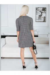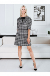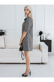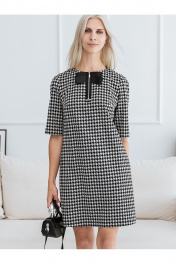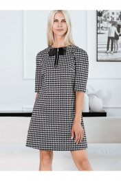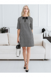 Женское платье А-силуэта, изготовлено из плотной эластичной ткани с жаккардовым рисунком гусиная лапка. Застежка на потайную молнию сзади, металлическая молния по переду является декором, бант выполнен из репсовой тесьмы. Рукав фонарик с вытачкой по центру от плечевого шва. Нагрудные вытачки по переду. Параметры девушки на фото 174/84-69-94, размер платья 44.