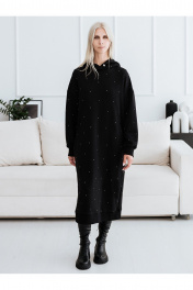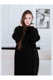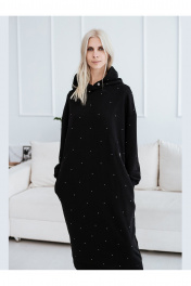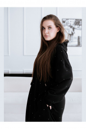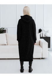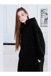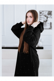 Женское платье-толстовка со стразами. Изготовлено из натуральной, теплой, плотной ткани футер 3х нитка петля. Силуэт платья прямой, свободный, покрой оверсайз. Фигурные рельефы по переду и спинке. Карманы в боковых швах. Манжеты и нижняя планка платья из кашкорсе. Платье с капюшоном, капюшон с утяжкой, с резинкой и металлическими фиксаторами. Декор термостразы, металлическая фурнитура.