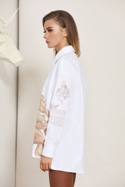Рубашка свободного силуэта со спущенной линией плеча и втачным одношовным рукавом с манжетой и планкой, левый рукав с принтом. Полочка с принтом VENERA, застежкой на потайную застежку с воротником на стойке.
