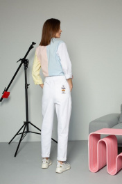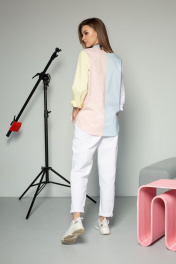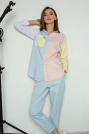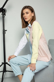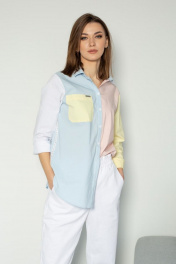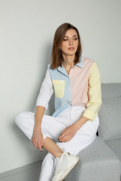 Блузка прямого силуэта с втачным рукавом на манжете с пуговицами. Воротник отложной на стойке, застежкой спереди на пуговицы. Правая полочка с карманом с декоративной деталью с логотипом. По боковому шву пришита декоративная тесьма. Спинка со средним швом. Блузка выполнена в нежных разбеленных оттенках голубого, розового, желтого и белого.