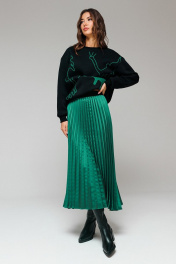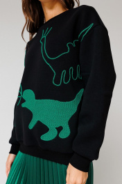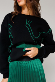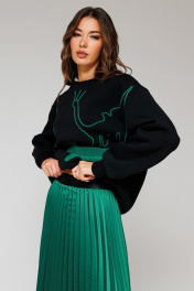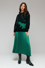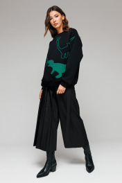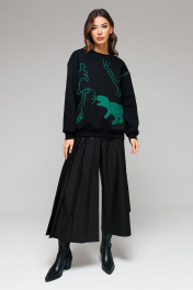 Джемпер прямого силуэта с втачным рукавом и спущенной линией плеча. По низу рукавов манжета из довяза. По переду вышивка декоративной тесьмой "Динозавры". По низу изделия и горловине планка из довяза.
