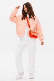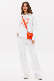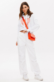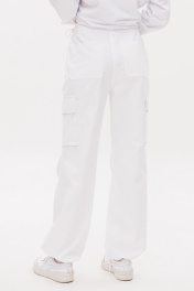 Брюки карго прямого силуэта, из джинсовой ткани, на притачном поясе и застежкой-гульфик. Часть пояса отсторечно резинками и вставлена эластичная тесьма с фиксаторами. По переду карманы в боковых швах и накладные карманы по боковому шву с клапаном. По цетру брюк горизонтальные складки. Внизу брюки на эластичной тесьме с фиксаторами. На задней половике брюк вверху вытачки и накладные карманы.
