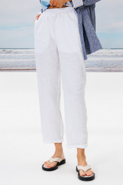 Льняные брюки полуприлегающего силуэта, слегка зауженные к низу, на притачном, отстроченном поясе с резинкой. Вверху по переду имитация застежки-гульфик. По переду карманы в боковых швах.