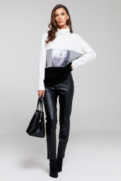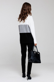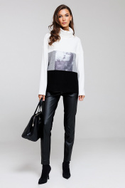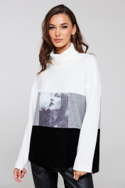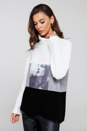 Джемпер 3-цветный прямого силуэта со спущенной линией плеча. Рукав втачной. По переду печать «The girl with а flower». Спинка длиннее полочки, внизу по боковым швам обработаны разрезы. Воротник стойка с отворотом.