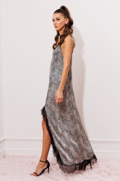 Платье на регулируемых бретелях, полуприлегающего силуэта, расширенное к низу. Полочка с рельефными швами под грудью, вставками из кружева по краю выреза. С фигурным разрезом по левой стороне платья и кружевом, переходящим на низ изделия и на спинку. Спинка на регулируемых бретелях вверху. Низ с отделкой из кружева.