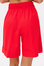 Шорты льняные на притачном отстроченном поясе со шлевками, в которые втянут шнурок из основной ткани с наконечниками. По переду со складками от притачного пояса и карманами в боковых швах с наклонным входом. По низу шорт манжета.