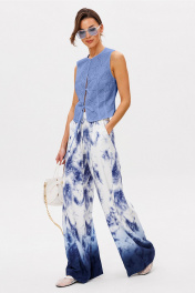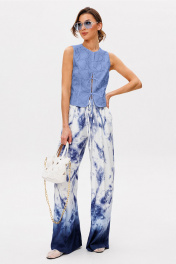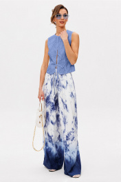 Жилет из ажурного шитья полуприлегающего силуэта без рукавов. Полочка с центральной застежкой на завязки и крючок, с 2-мя вертикальными вытачками от низа для лучшего прилегания изделия. Спинка с вертикальной вытачкой от низа и центральным швом. Жилет на подкладке из хлопка.