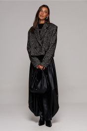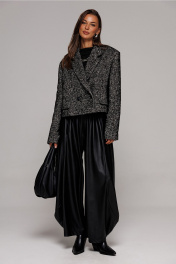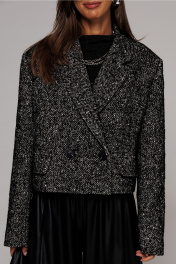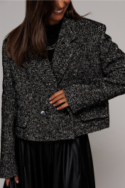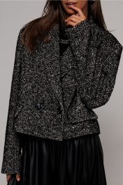 Жакет укороченный прямого силуэта, двубортный с втачным двухшовным рукавом. Полочка с застежкой на петлю-пуговицу и имитацией кармана с клапаном и отрезным бочком. Спинка с отрезным бочком и центральным швом. Воротник пиджачного типа с отрезной стойкой. Жакет на подкладке.