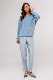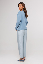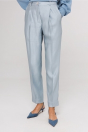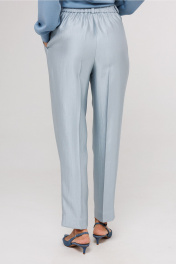 Брюки, зауженные к низу на притачном поясе со шлевками и застежкой-гульфик. Пояс застегивается на петлю-пуговицу и потайную петлю-пуговицу. По переду со складкой и карманами в боковых швах с наклонным входом. По переду и спинке заутюжены вертикальные стрелки по всей длине брюк. По спинке пояс на резинке. Внизу по боковым швам обработаны небольшие разрезы.