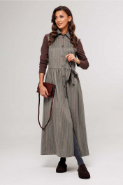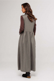 Платье длинное из костюмной ткани с втачным длинным одношовным трикотажным рукавом. Полочка с центральной застежкой на петли пуговицы и с нагрудными вытачками. По спинке нашивка "BUTER". Платье отрезное по линии талии и со сборкой по шву притачивания низа. Воротник рубашечный отложной на стойке. По линии талии бант из основной ткани. Платье без подкладки.