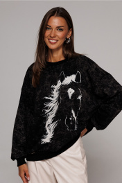 Джемпер из трикотажного полотна свободного силуэта, слегка заужен к низу, с втачным рукавом и спущенной линией плеча, с манжетой из отделочной ткани по низу рукава. По переду печать "HORSE" и нашивка с гравировкой "BUTER", низ фигурный. Спинка длиннее переда. По горловине и низу изделия притачная планка из довяза.